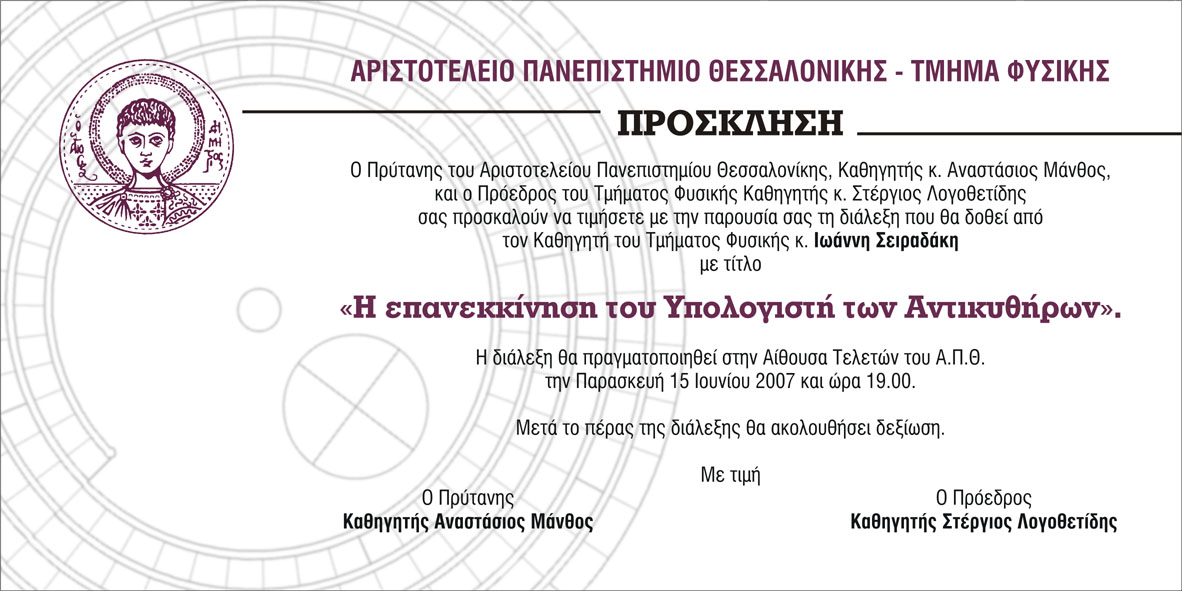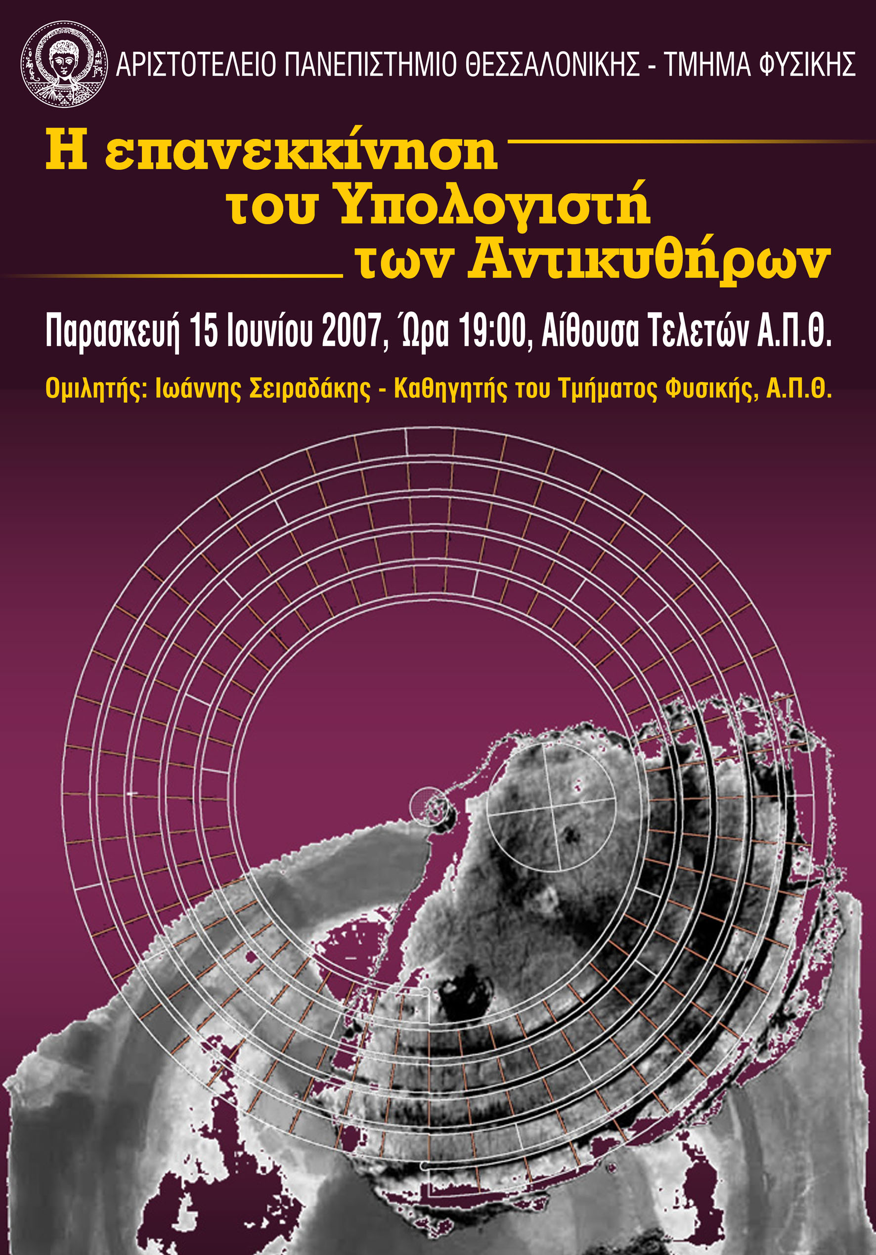 Ο Μηχανισμός των Αντικυθήρων βρέθηκε τυχαία το 1900 μ.Χ., σε ένα αρχαίο ναυάγιο κοντά στα Αντικύθηρα, από Σύμιους σφουγγαράδες, που είχαν αγκυροβολήσει εκεί, λόγω κακοκαιρίας. Οι διαστάσεις του ήταν περίπου 30x20x10 cm δηλαδή λίγο μεγαλύτερος από ένα σημερινό Laptop. Η λειτουργία του Μηχανισμού των Αντικυθήρων έχει πλέον αποκρυπτογραφηθεί και πάνω από 2000 γράμματα του εγχειριδίου χρήσεως έχουν διαβαστεί (μετά από 2000 χρόνια!) με τη χρήση εξειδικευμένων καινοτόμων μεθόδων. |
