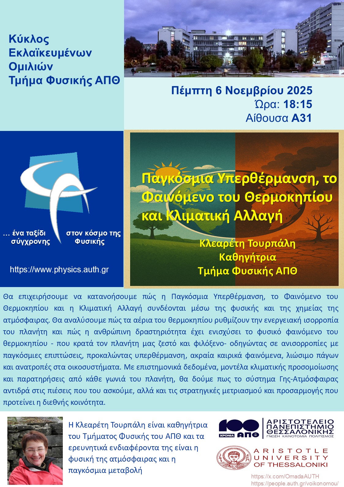 Θα επιχειρήσουμε να κατανοήσουμε πώς η Παγκόσμια Υπερθέρμανση, το Φαινόμενο του Θερμοκηπίου και η Κλιματική Αλλαγή συνδέονται μέσω της φυσικής και της χημείας της ατμόσφαιρας. Θα αναλύσουμε πώς τα αέρια του θερμοκηπίου ρυθμίζουν την ενεργειακή ισορροπία του πλανήτη και πώς η ανθρώπινη δραστηριότητα έχει ενισχύσει το φυσικό φαινόμενο του θερμοκηπίου - που κρατά τον πλανήτη μας ζεστό και φιλόξενο- οδηγώντας σε ανισορροπίες με παγκόσμιες επιπτώσεις, προκαλώντας υπερθέρμανση, ακραία καιρικά φαινόμενα, λιώσιμο πάγων και ανατροπές στα οικοσυστήματα. Με επιστημονικά δεδομένα, μοντέλα κλιματικής προσομοίωσης και παρατηρήσεις από κάθε γωνιά του πλανήτη, θα δούμε πως το σύστημα Γης-Ατμόσφαιρας αντιδρά στις πιέσεις που του ασκούμε, αλλά και τις στρατηγικές μετριασμού και προσαρμογής που προτείνει η διεθνής κοινότητα.