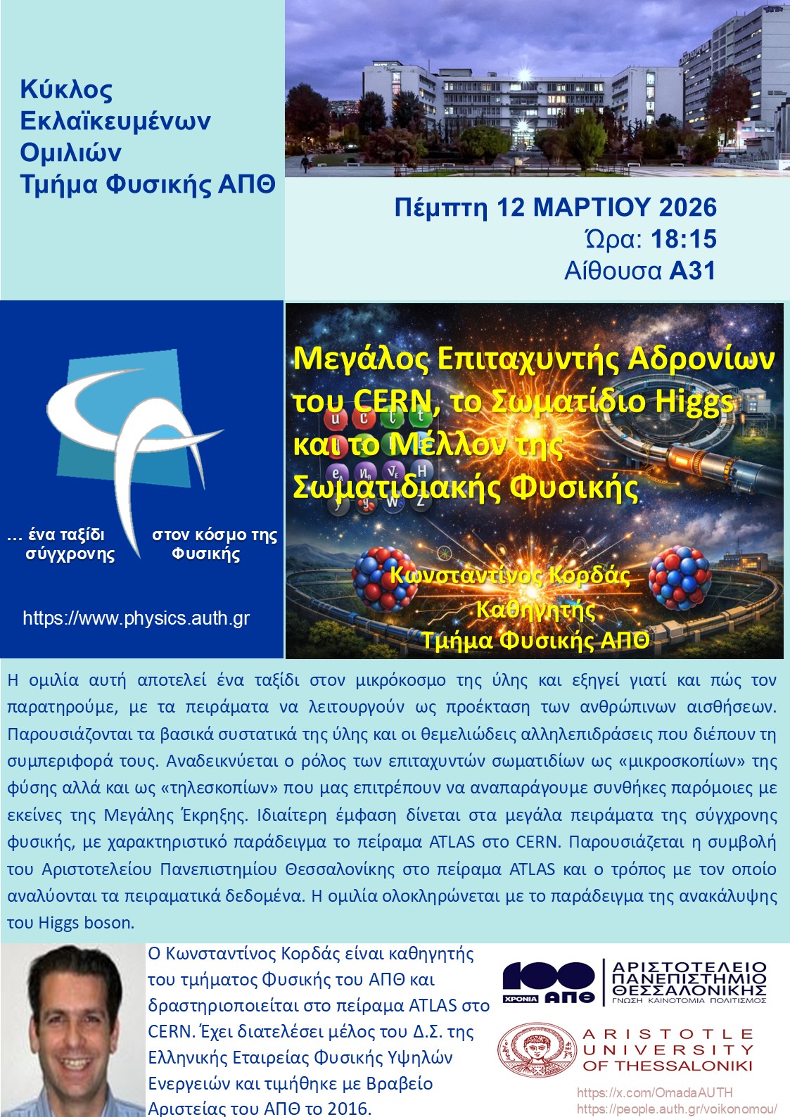 Περίληψη: Η ομιλία αυτή αποτελεί ένα ταξίδι στον μικρόκοσμο της ύλης και εξηγεί γιατί και πώς τον παρατηρούμε, με τα πειράματα να λειτουργούν ως προέκταση των ανθρώπινων αισθήσεων. Παρουσιάζονται τα βασικά συστατικά της ύλης και οι θεμελιώδεις αλληλεπιδράσεις που διέπουν τη συμπεριφορά τους. Αναδεικνύεται ο ρόλος των επιταχυντών σωματιδίων ως «μικροσκοπίων» της φύσης αλλά και ως «τηλεσκοπίων» που μας επιτρέπουν να αναπαράγουμε συνθήκες παρόμοιες με εκείνες της Μεγάλης Έκρηξης. Ιδιαίτερη έμφαση δίνεται στα μεγάλα πειράματα της σύγχρονης φυσικής, με χαρακτηριστικό παράδειγμα το πείραμα ATLAS στο CERN. Παρουσιάζεται η συμβολή του Αριστοτελείου Πανεπιστημίου Θεσσαλονίκης στο πείραμα ATLAS και ο τρόπος με τον οποίο αναλύονται τα πειραματικά δεδομένα. Η ομιλία ολοκληρώνεται με το παράδειγμα της ανακάλυψης του Higgs boson, αναδεικνύοντας πώς η ανάλυση των γεγονότων οδηγεί σε νέες θεμελιώδεις ανακαλύψεις για τη φύση.