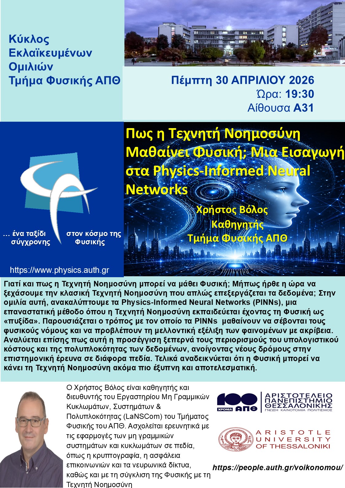 Γιατί και πως η Τεχνητή Νοημοσύνη μπορεί να μάθει Φυσική; Μήπως ήρθε η ώρα να ξεχάσουμε την κλασική Τεχνητή Νοημοσύνη που απλώς επεξεργάζεται τα δεδομένα; Στην ομιλία αυτή, ανακαλύπτουμε τα Physics-Informed Neural Networks (PINNs), μια επαναστατική μέθοδο όπου η Τεχνητή Νοημοσύνη εκπαιδεύεται έχοντας τη Φυσική ως «πυξίδα». Παρουσιάζεται ο τρόπος με τον οποίο τα PINNs μαθαίνουν να σέβονται τους φυσικούς νόμους και να προβλέπουν τη μελλοντική εξέλιξη των φαινομένων με ακρίβεια. Αναλύεται επίσης πως αυτή η προσέγγιση ξεπερνά τους περιορισμούς του υπολογιστικού κόστους και της πολυπλοκότητας των δεδομένων, ανοίγοντας νέους δρόμους στην επιστημονική έρευνα σε διάφορα πεδία. Τελικά αναδεικνύεται ότι η Φυσική μπορεί να κάνει τη Τεχνητή Νοημοσύνη ακόμα πιο έξυπνη και αποτελεσματική.