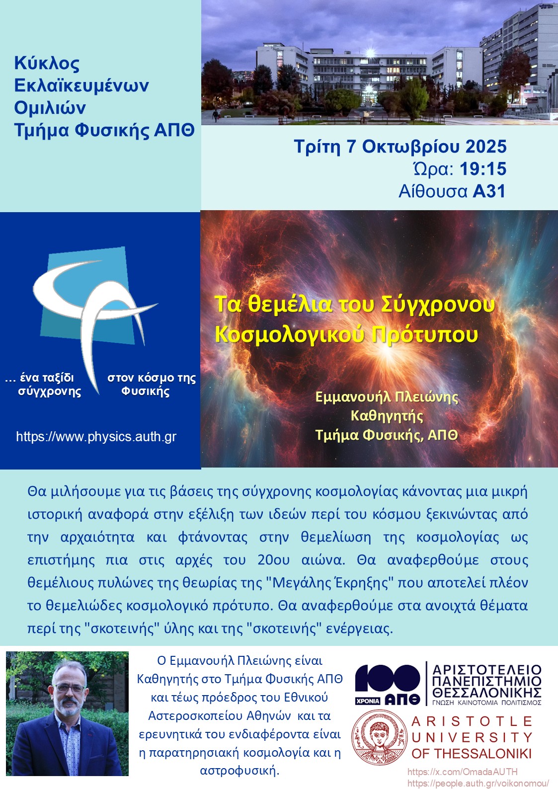 Θα μιλήσουμε για τις βάσεις της σύγχρονης κοσμολογίας κάνοντας μια μικρή ιστορική αναφορά στην εξέλιξη των ιδεών περί του κόσμου ξεκινώντας από την αρχαιότητα και φτάνοντας στην θεμελίωση της κοσμολογίας ως επιστήμης πια στις αρχές του 20ου αιώνα. Θα αναφερθούμε στους θεμέλιους πυλώνες της θεωρίας της “Μεγάλης Έκρηξης” που αποτελεί πλέον το θεμελιώδες κοσμολογικό πρότυπο. Θα αναφερθούμε στα ανοιχτά θέματα περί της “σκοτεινής” ύλης και της “σκοτεινής” ενέργειας.